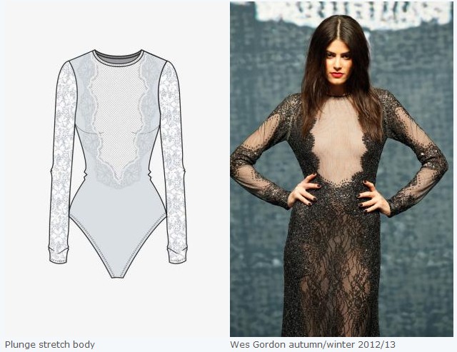 受2012-2013秋冬发布会上夸张的V字领设计启发,这种戏剧化效果的透视低胸领内衣最好采用设计感蕾丝或装饰艺术风格透视面料及不透视针织的镶嵌细节。更多关于低胸领设计的信息,请参照相关的发布会报道。