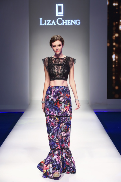 奢华的蓝印花与色泽鲜明的彩叶花,跃然于华服之上,模特从朦胧的光影深处走来,一颦一笑一转身,尽是优雅魅影。