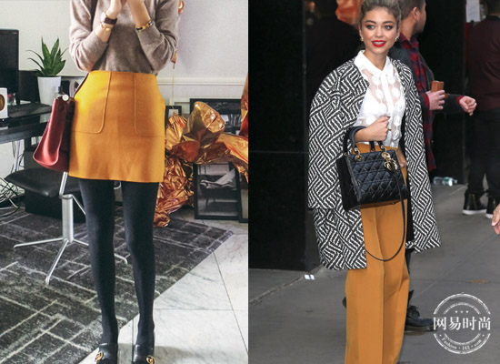 既然不能大面积穿着,那就得在小单品上做文章,在整体造型里添加一些橡木黄色单品,直接打亮整身造型。比如说下半身的裙装裤装,即使整身黑白灰也不会暗淡▼