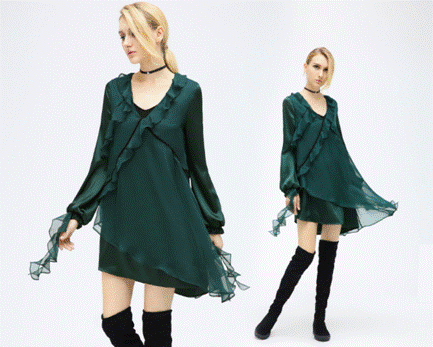 荷叶边装饰V领连衣裙DS768,浪漫温柔的荷叶不再满足于点缀边边角角,赋予服饰律动感和浪漫的味道,演绎都市女性时髦精致造型。