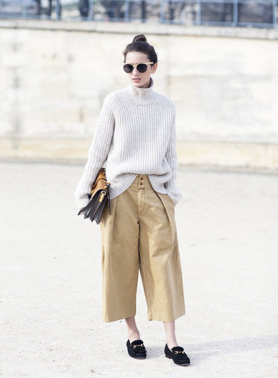 高领毛衣与阔腿裤也常常走到一起,时装Icon们用这样的搭配展现了女性不一样的帅气与精炼,配上对比感强烈的阔腿裤,性感洒脱的时尚名伶就这样诞生了。比如下面这位时尚博主选择高领毛衣与卡其色七分阔腿裤搭配,经典耐看。