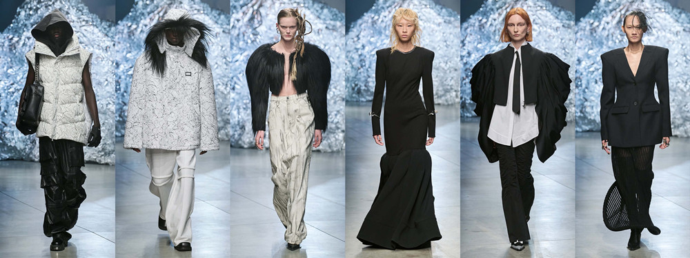 有感于后世界末日的假想,设计师AnnaYang杨子延续过往「后人类」概念,以「后末世启示录」为主题,于ANNAKIKI 2023秋冬系列中挥洒后末世场景,想象人类如何汇聚成群,互持共进。她在天马行空的未来主义风格中融入赛博朋克和废土朋克要素,构想当现代文明毁灭,探讨人类在废墟中如何学会生存,找寻自我。