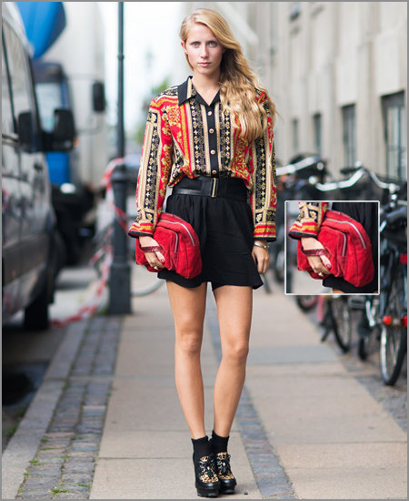 民族感十足的一款衬衣,用各种强烈色彩的对比凸显出一种只有御姐可以驾驭的感觉。这款衬衣的设计墨守成规却又有自己的特点,色彩的运用和搭配,不管是从哪一面看起来都是那么舒服。就算是搭配的包包也用红色来顺接,而帆布相对于整体来的格外诙谐
