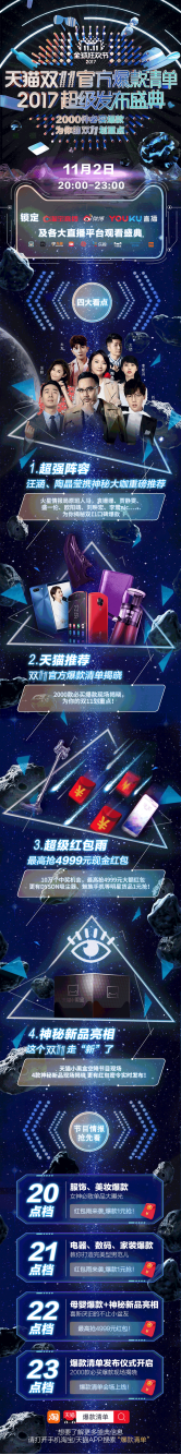晚会20点开始,届时将有整点红包雨来袭,爆款1元就能抢到手,最高可抢4999元超级大红包!更多内容敬请锁定淘宝直播、微博、优酷直播,及各大直播平台,观看天猫双11官方爆款清单2017超级发布盛典。这个双11前哨战,看全明星直播揭秘爆款清单,精彩不容错过。