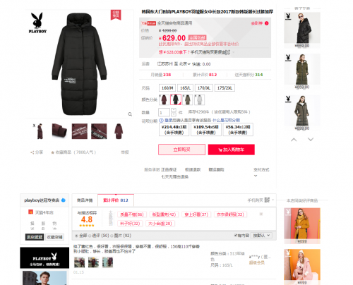 不信我举个例子吧,天猫地址:时尚PLAYBOY羽绒服女中长款2017新款韩版潮长过膝加厚 天猫价629,800多好评4.8+你猜需要多少钱?