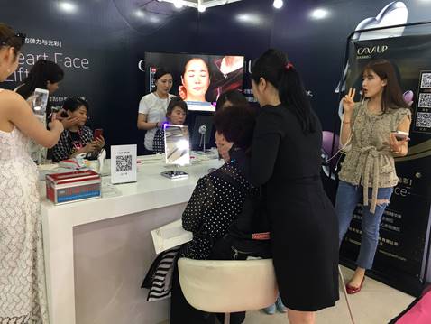 现场工作人员为前来体验的观众亲身展示产品效果,CAXA UP以两种护肤模式(微电流护肤模式和离子护肤模式)配合保湿美白精华液CAXA UP SERUM,将精华液深层导入到皮肤真皮层中,辅以刮痧的手法让提拉与护肤一步到位。把配套的精华液(用胶原蛋白玻尿酸网包裹的内含VC衍生物的纳米胶囊)涂抹到皮肤后,经过离子护肤模式,玻尿酸网就会自然破裂,将维C衍生物导入到皮肤真皮层中。CAXA UP微电流模式能够促进血液循环、排毒、提拉、紧致肤质,负离子护肤模式可以把好的化妆品成份深层导入到皮肤真皮层中,从里到外改善肤质,可以达到深层保湿、美白、平滑紧致、光亮、收缩毛孔的效果。
