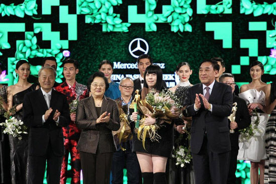 中国国际时装周名誉主席林文漪((左二)、杜钰洲(左一)、王天凯(右一)为第18届中国时装设计“金顶奖”获得者潘怡良颁奖