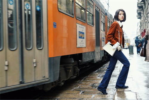 焦糖色上衣、白色包包、藏蓝色裤子,与背景融合的浑然一体,在大牌云集的米兰街头,棉麻艺术家茵曼,依然气场十足。