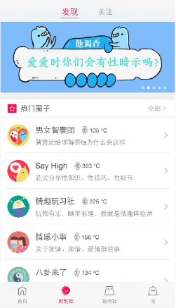 打开她他社,就如同敲开新世界的大门,这里有性趣学院、世界G点、情趣测试、Ta问Ta答等各种特色板块,社交与趣味结合,情趣体验与理性探讨和谐共存。不管是畅聊私密情事,还是新奇热辣的姿势解读,都足以打破你过去对“情趣”的狭隘定义,让你在这里邂逅一场华丽的情趣冒险。