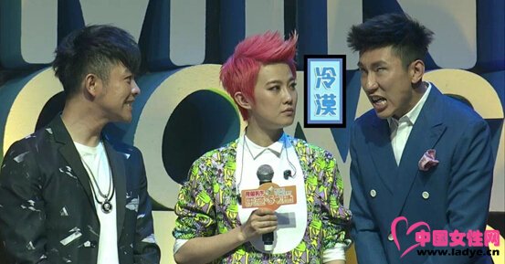 一本正经鼓起嘴巴,假装不认识旁边脸歪眼斜的两个主持人。