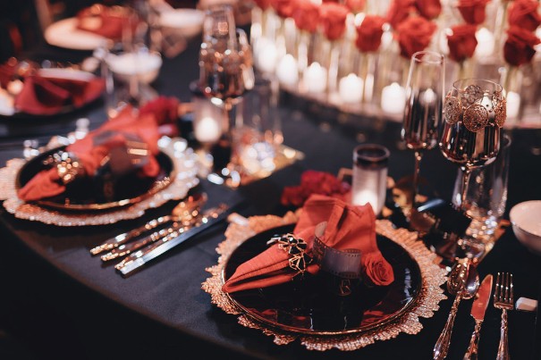 婚礼以黑色、勃艮第红色为主打色系,打造老电影般的格调并极具时尚感,金色作为细节造型的辅助色,使整场婚礼更加奢华,具有质感。