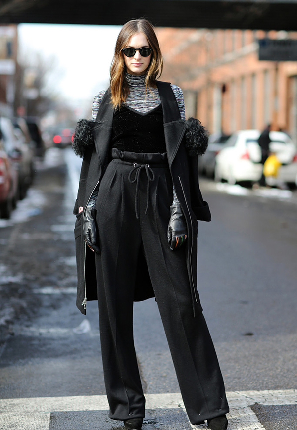 全黑色最重要是要穿出层次感,才真的会显瘦,黑色的阔腿裤腰线很高,再穿一双高跟鞋,打造一种“胸以下都是腿”的视觉效果。