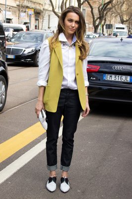 与长外衣配套的是称作维斯特(vest)的背心。也是收腰,后背开衩,前门襟与外衣相同,密缀纽扣。起初有长袖,后采演变成无袖的背心,衣身也变短。维斯特作为室内服使用,外出或出席正式晚会时,一定要在外面穿上鸠斯特科尔。由于鸠斯特科尔用料过于奢华,遭到政府禁止,人们就把华美的面料用在维斯特上.