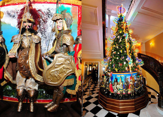 Fendi 2014,上海而意大利品牌Dolce & Gabbana,2013年在伦敦的Claridge酒店设计了这样一棵圣诞树——上半部分是各种颜色的彩灯和绿色圣诞树主体,底座的特别之处在于站了一圈人偶,来自意大利人称之为“普皮(Pupi)”的西西里岛木偶戏。