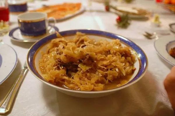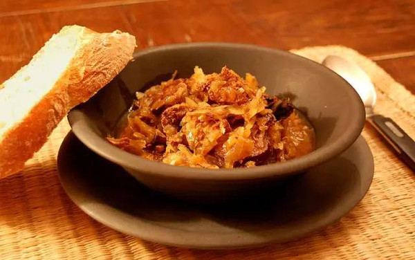 波兰酸菜“必高思”也称“猎人炖”,被称为波兰国菜,是一个令人愉快的混合各种肉类,蘑菇,白菜的炖菜,圣诞节每个人都渴望饱餐一顿。这道菜最早被发现记载在1682年的文献当中,主要的材料为马铃薯。早期的食谱中并没有加入蔬菜和肉类,而是加入香茜、洋葱及白醋。