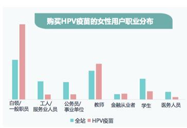 这一部分女性消费者对健康关注度最高、健康消费意识相对超前,也是九价HPV疫苗接种需求最大的人群。京东平台数据显示,2017年购买HPV疫苗的女性用户超过95%来自于中产用户,在职业上以白领为主,占比超过五成;其次是教师群体,占比26%。其中,80后用户占比超过6成,90后女性用户占比20%,均处于三种HPV疫苗的推荐接种年龄段。
