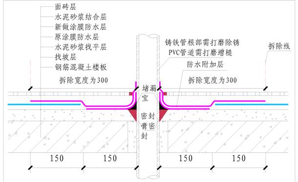 1)从正面拆除管道周边的面层及结合层直至原结构层表面(拆除宽度为300mm)。注意:原防水层应保留150mm完好无损;
