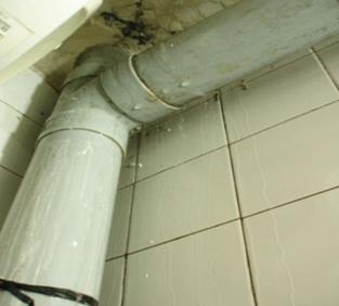 水穿过防水层,通过穿楼板管道根部与结构楼板交界部位渗漏到相对应的下部房间,在下部房间的顶部局部部位出现明显的水迹或潮湿发霉、掉皮、泛砂的现象。