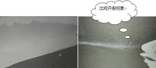 以上图片左边是JS按照正常配比,右边是加了粉料50%的水泥,在墙地交接处涂刷测试,一天后加水泥的涂料出现开裂现象。JS在成膜机理上,无机胶凝材料与液料中的水发生水化反应,形成一定量的水化凝胶体,而乳液中聚合物颗粒向浆料中分散,吸附在水泥和水泥水化产物以及填料表面。随着水分的消耗和散失,聚合物颗粒之间逐渐靠拢,最终相互凝聚在一起,并黏结水化和未水化的水泥颗粒而形成涂膜。而水泥水化的过程会产生收缩,水泥掺量过大必然会增大水化过程中的收缩应力,尤其是在阴角应力比较集中地部位,开裂就很容易产生。JS防水涂料在使用的过程中一定要按照严格的配比,如果涂料过于粘稠可以根据实际情况加不超过15%的水,不可掺入普通硅酸盐水泥使用。