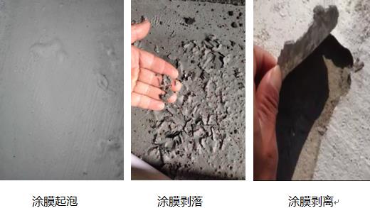 在建筑涂料和油漆行业,流传着这样一句话:“基材好,漆才好”,意思是涂料要想表现出良好的应用效果和耐久性,基层的处理十分重要和关键。这句话表达的意思在家装防水领域也同样适用:如果涂刷防水涂料的基层强度低,掉砂起粉严重,未经过加固处理直接涂刷防水涂料的话,防水涂料与基层的粘结力低,防水层与基材未能融为一体,容易出现起皮,剥落,鼓泡等现象,影响最终的防水效果,如下图所示的情况。