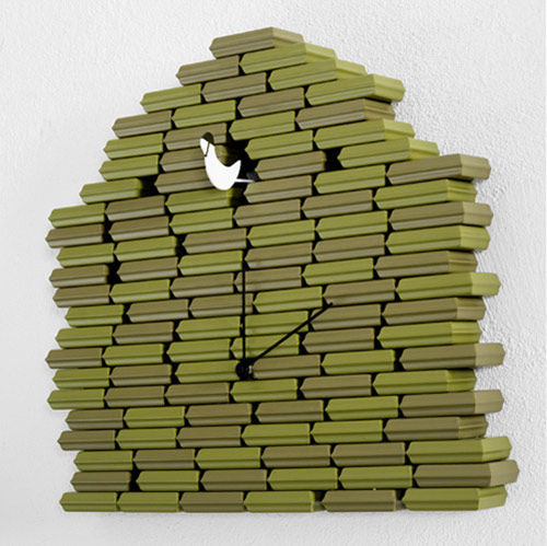 此款布谷鸟钟的小屋造型,是由111根已上清漆的木块组成,深浅不同的绿色色调,清新自然,带有层次感。另外,报时布谷鸟是以激光切割手工上色的金属制成,精致可爱。