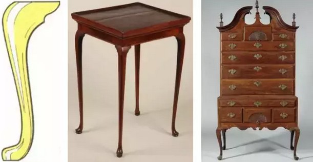 18世纪初期,威廉-玛丽风格、安妮女王风格在美式家具中独树一帜。威廉和玛丽式古董家具采用的球形旋脚饰风格,曲线优美、尤其注重在家具脚上调情。在安妮女王式古董家具中,垫脚、铲脚和三裂脚也比较常用。它的形状创意来源于动物膝盖以下的部分。