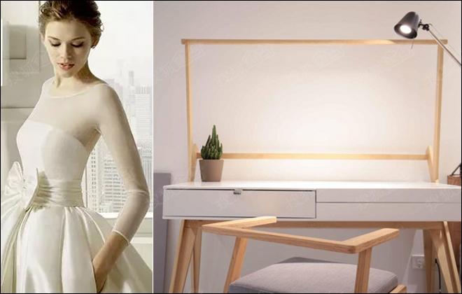 这款梳妆台由四条木架和极简的白色盒子桌面组合而成,造型酷似秋千,婉约优雅。抬起桌面,架起镜面,就成了梳妆台。最上面的杆子,还可以悬挂一排LED灯,是一款充满设计感又实用的多功能梳妆台。平时不用时,放下桌板,还可以当书桌使用。