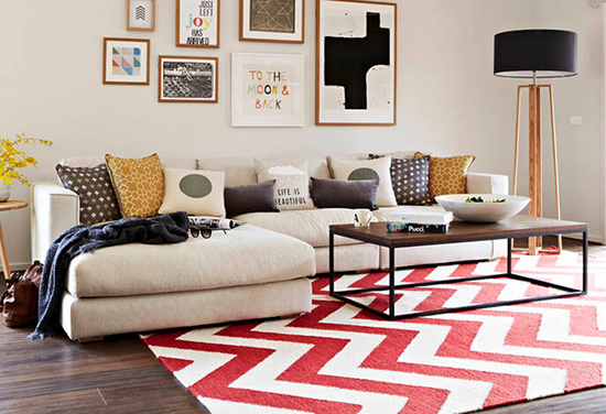 别致的V字形图案 别致的V字形图案 大客厅在一个手工羊毛地毯的装饰下变得生动起来。图案是别致的V字形,红色和白色的搭配具有视觉冲击力,整体视觉效果带有一种戏剧性的色彩。