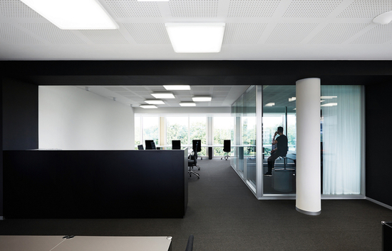 特定领域设置了不同的工作区,同时打造了固定工作站,以应对公司日常运行及主要的灵活工作时间。除了经典的功能性独立办公室和代表性的合作办公室外,还打造宽敞的开放区,尤其是位于办公层的大厅,打造了内置的玻璃团队工作室。清晰的黑白配色方案被应用于墙壁、天花和整个区域的内置家具,形成一个现代的平衡。
