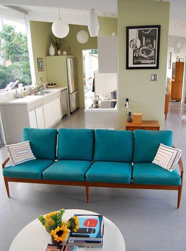 苹果绿低调浅淡,房主选择了一部分作为主题突出,搭配白色墙面和橱柜清新无比。想要室内不单调,那么一款色彩高调的简约设计的沙发必不可少,作为视觉中心的沙发是点睛之笔。