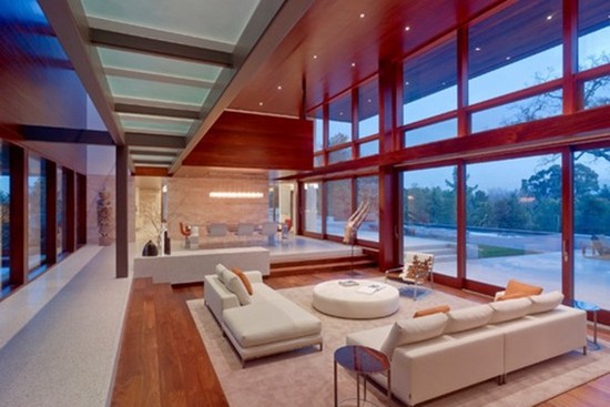 红色的天棚和落地窗框架给简约之至的客厅加上了一丝妖娆,大户型客厅尽享面积优势,即使在家里散散步也未尝不可。