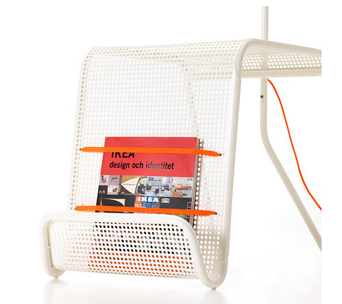 桌子结构是网格状,为了保持桌面整洁,收纳更多物品,可以用橡皮带将灯具电线和杂志书籍规整到位,或者打造你自己的收纳模式。