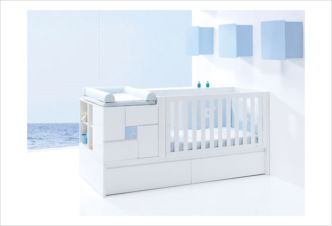 变化1:组合成婴儿床、收纳柜、尿布台与子母装的功能,适合0-3岁使用。