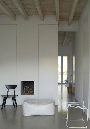 编辑点评:在墙壁里掏空一个方形空间用来存放壁炉的木材,充分地挖掘了可利用的收纳空间。格栅天花的凹凸造型让客厅更有画面感。阳光透过木框玻璃门进入室内,让狭长的走廊显得干净明亮。