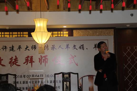 来源:女性伊网 编辑:飞 点击: 次日期:2018-02-062月4日,苏州太湖之滨的苏州太湖国际会议中心暖意融融,国家级非物质文化遗产项目明式家具制作技艺代表性传承人、吴门大家创始人许建平大师收徒仪式隆重举行,羊文娟、羊洋姐