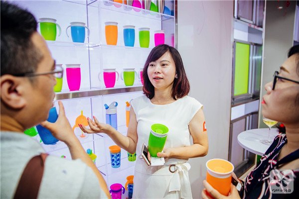 市场总监邹宁芳女士为媒体介绍Munchkin 360°防漏魔术杯