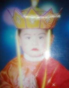 如果说穿古装是童年囧照的一大流派的话,那另一派无疑就是化浓妆了,在网友上传的照片中,大多数在照相馆拍的艺术照,都有一副标准妆:打腮红、涂口红,眉心还点上一个美人痣,无论男女,统统如此。