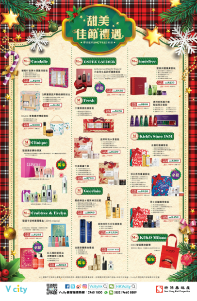 美妆品牌纷纷推出琳琅满目的商品优惠,折扣力度完全不输双十一!拥有多达25个高人气美妆品牌的屯门V city商场今年看点十足,商场联合场内18家国际知名美妆护肤品牌,于即日起至12月31日,逾40个圣诞套装低至25折发售,当中包括Estee Lauder、SHISEIDO、Fresh、Kiehl’s、RMK、Guerlain法国娇兰及Laura Mercier等多个国际知名美妆品牌,部份套装更于V city独家发售!即日起至2017年12月31日期间,在V city指定美容商户以电子货币消费满港币1,000元,更可获赠V city港币50元赠券一张!