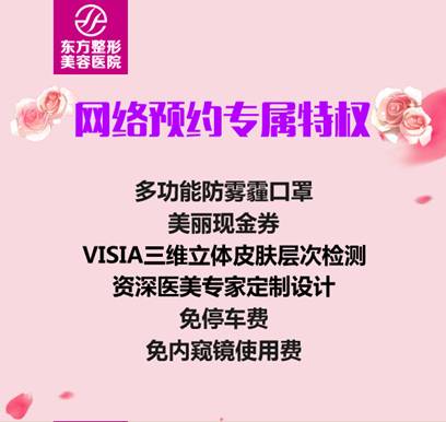 在医院官网上咨询设计,即可凭网络预约短信到医院扫描官方及贺院长二维码领取多功能防雾霾口罩一个;如果消费,还可以凭短信充当200元代金券使用。东方整形女神季为您妆点美丽!