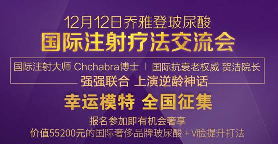 幸运模特,全国征集!此次乔雅登国际注射技术交流会上,价值55200元的国际奢侈玻尿酸--乔雅登+来自印度的国际注射大师Chiranjiv Chhabra博士将携国际抗衰老权威贺洁院长,现场演绎国际奢侈品牌乔雅登玻尿酸的V脸提升打法,现面向全国征集一名面部明显松垂的幸运儿,世界最好的奢侈玻尿酸遇上国际最好的注射专家,免费安全逆龄10岁的机会仅有一次!稀有名额快快抢起!