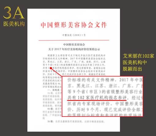 2017年中国整形美容协会对北京、广东、四川等9个省(市区)的医疗美容机构,开展了历时9个月的多方位考察评定,在102家报名参评医疗机构中,成都艾米丽医疗美容门诊部脱颖而出荣获3A级评定!