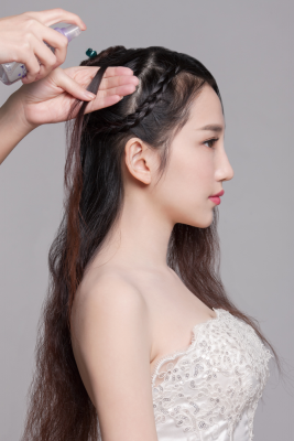 甜美韩系风格的新娘造型主要突出需要整体仙女式的温柔浪漫感。造型以卷发、辫子、蝴蝶结为主。造型尽量松散、自然一些,才能突出新娘的仙女气息。所以在处理发丝的时候注意纹理走向,不要喷过多的发胶,避免头发生硬而缺少灵动感。佩戴蝴蝶等甜美饰品可以让新娘看起来更加可爱,年龄感更小,因此,该造型建议为年龄感小且长相甜美的新娘打造。甜美韩系风格的新娘造型主要突出需要整体仙女式的温柔浪漫感。