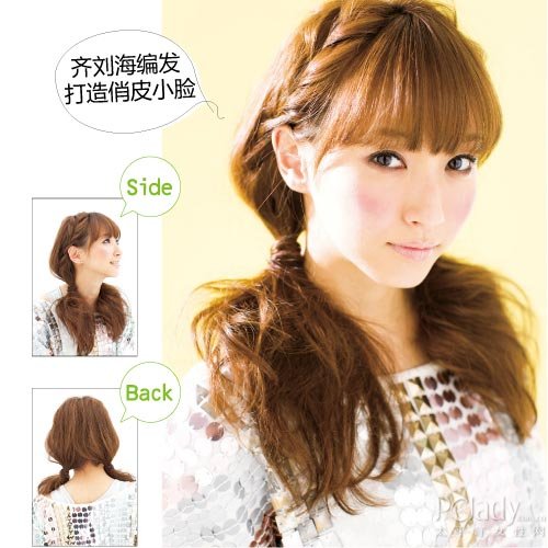 蓬松的编发样式,编织出所谓的复古俏皮范。简单的双侧马尾辫,因为编发的加入显得非常轻松自在,编发并没有怀旧到一直延续到发尾,而是在耳后停止了,显出一种别出心裁的可爱,发尾的蓬松成功吸引了视觉注意力,在大面积齐刘海的配合下,小脸指数相当高哦。