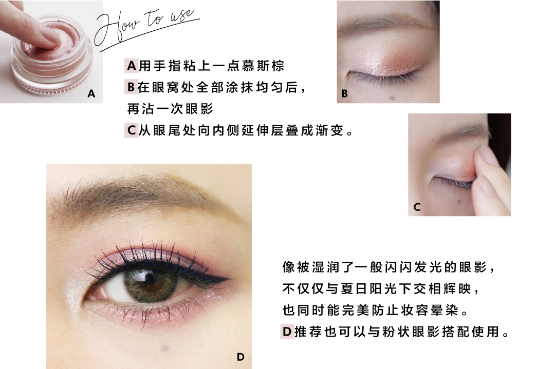 用慕斯棕均匀涂抹眼窝后,再沾一次眼影,从眼尾处向内侧延伸叠加打造渐变色,即可get现下最流行的夏日艳阳般水光眼妆。