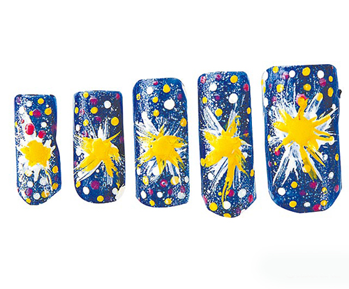 以同样方式沾黄指甲油(D)勾勒出爆裂图案后,以木棒随意沾取各色指甲油随意轻点装饰。