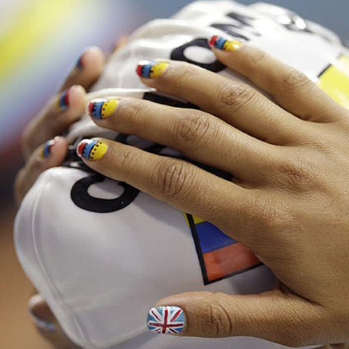 游泳运动员Carolina Colorade Henao的彩色美甲在大拇指选择了英国国旗图案。