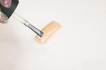 以粉肤色指甲油涂满甲片,再以银色亮片指甲油叠刷接近指缘的半月型。