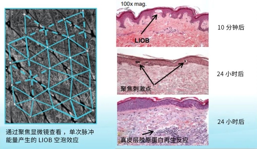 其中,755原生皮秒特有的蜂巢透镜(Focus™ Lens Array)可以更有效地聚焦激光能量,输出激光能量达到原能量的20倍,让每一个激光束能量均匀并形成LIOB空泡效应,让表皮不会有开放性伤口,以机械冲击力刺激让真皮层有炎症反应,增加胶原蛋白及弹性纤维,从而达到嫩肤紧致、修复痤疮痘印的效果!相比传统点阵技术,拥有蜂巢透镜的755原生皮秒可以让30%能量照射在表皮90%皮肤上,70%能量照射到少于10%的组织微点,形成立体点阵技术,在点与点之间也有能量治疗。