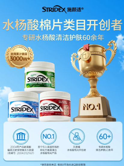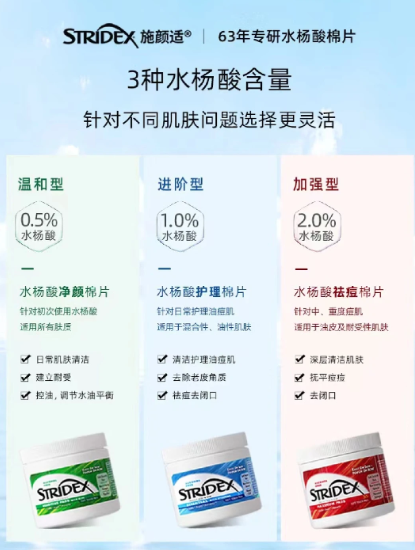 经过朋友的种草,我上网查了一下Stridex施颜适品牌,像挖到宝似的,好一个厉害的品牌。它有60多年的悠久历史,其样品被美国国家历史博物馆所收藏,还是无酒精水杨酸棉片的开创者!再看它旗下的产品,除了我朋友说的那几个,还有身体棉片和洁面乳同样广受好评,不得不说,在清洁护肤这块,施颜适绝对是专业中的“扛把子”,绝对值得信赖!
