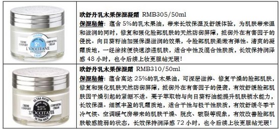 欧舒丹经研究发现,以传统方式提炼的乳木果油,富含Omega6等多种天然因子,能有效保湿滋养肌肤,高效防护、温和舒缓肌肤。欧舒丹实验室运用纯粹精炼科技,以不同浓度的乳木果油,调配出明星都爱用的乳木果系列,来满足不同肤质的需求,神奇的乳木果油能显著修复和强健肌肤天然防御屏障,提高肌底保湿力,让脸部和手部肌肤都获得真正的健康的滋润守护,肌肤“快乐”得能掐出水来。